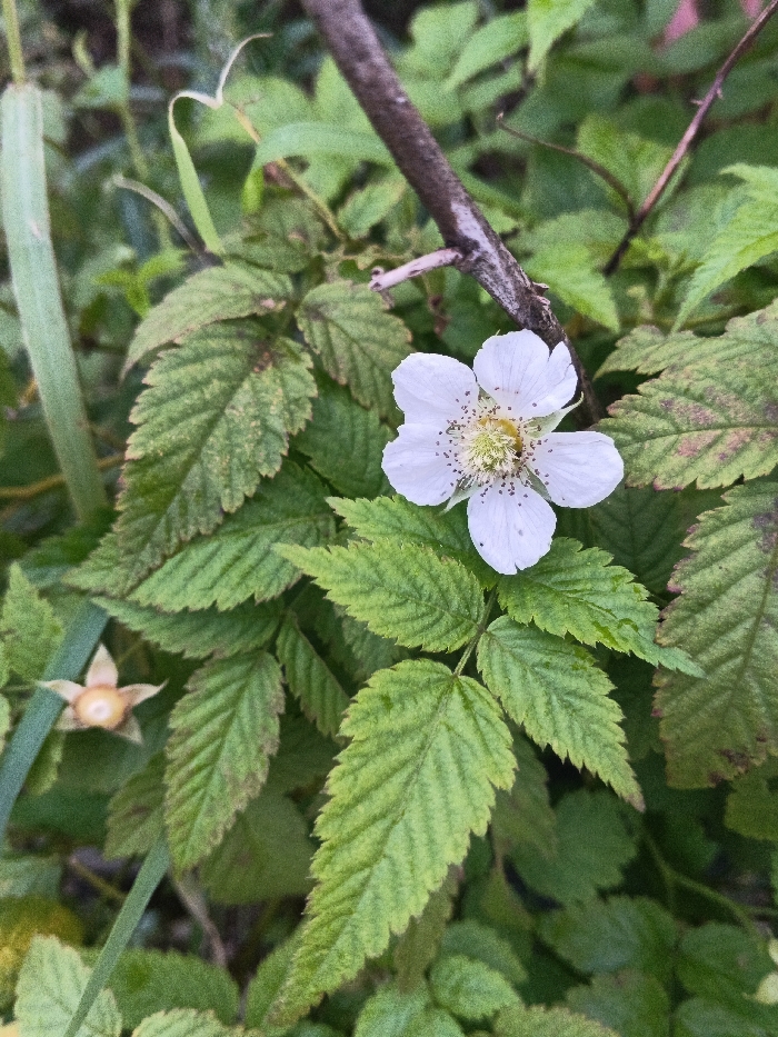 The image displays a close-up view of natural vegetation, featuring a single white five-petaled flower with a prominent central yellow stamen cluster dotted with dark anthers. This flower is positioned among numerous green, serrated leaves, consistent with a *Rubus* species. Some leaves exhibit minor brown or reddish discoloration along their edges. A dark brown, woody branch or stem extends diagonally from the upper left toward the upper right of the frame. In the lower-left quadrant, a small, pale orange-tan object, likely an unripe fruit or closed bud, is partially visible amongst the foliage. A thin green stalk or blade of grass is present along the far left edge. The scene depicts a static, natural environment without human presence or artificial structures, located in the city of Unknown, Vietnam.