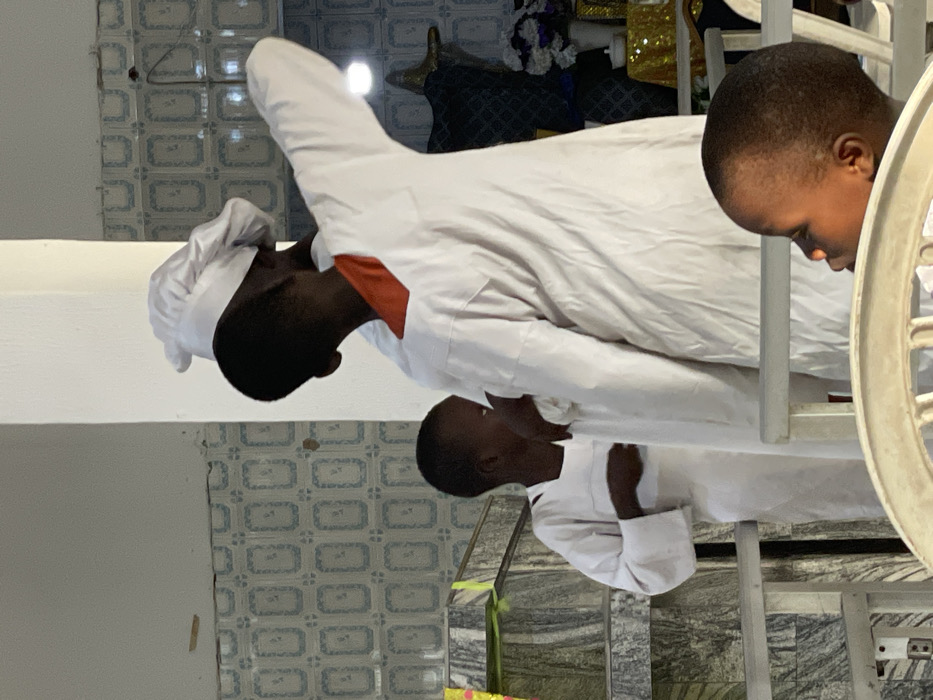 Three dark-skinned people wearing white robes and hats are positioned close together. One individual is bending over while wearing an orange garment under the robe. Another person is observing. The background consists of a wall with light blue tile designs, a partly visible gold decoration, and parts of a white structure.