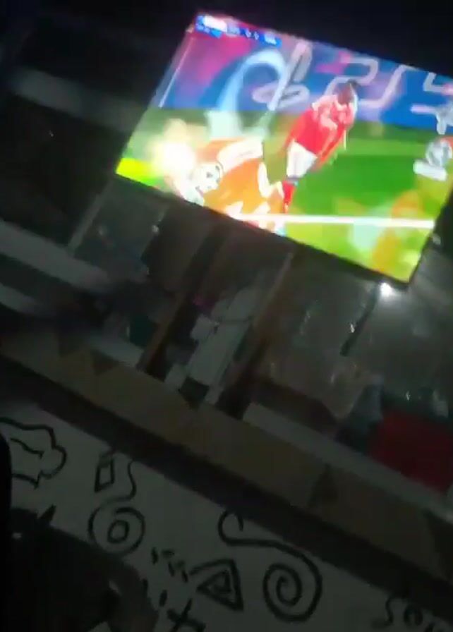 A person is watching a soccer game on TV. The TV screen displays the score as BEN 0-1 RMA. The room is dimly lit, and there is some graffiti on a nearby wall. The camera is tilted upwards, and the TV screen is in focus.