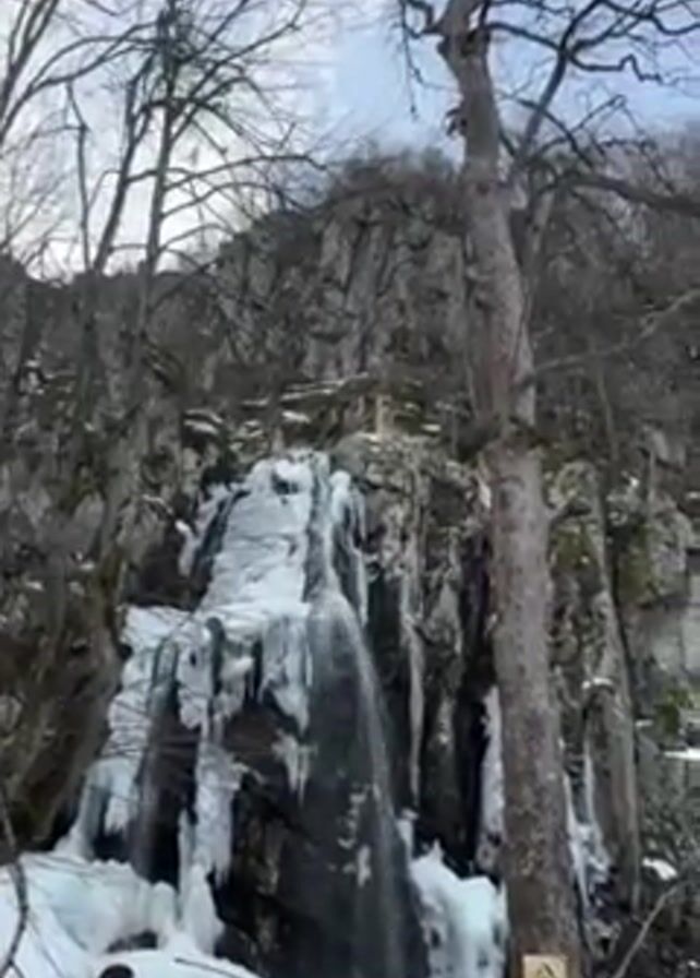 A group of people is standing in front of a partially frozen waterfall. The waterfall is cascading down a rocky cliff face, surrounded by bare trees and snow. The camera pans up from the base of the waterfall to the top of the cliff, then up to the sky, passing through more bare branches.