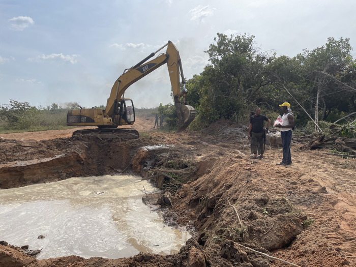 A yellow CAT excavator sits near a muddy pit filled with murky water. Two men stand nearby on a dirt embankment; one in a black shirt and the other in a yellow cap and white tank top, holding papers. Lush green trees are visible in the background. The surrounding area appears to be a construction or excavation site with disturbed earth. The sky is partly cloudy.