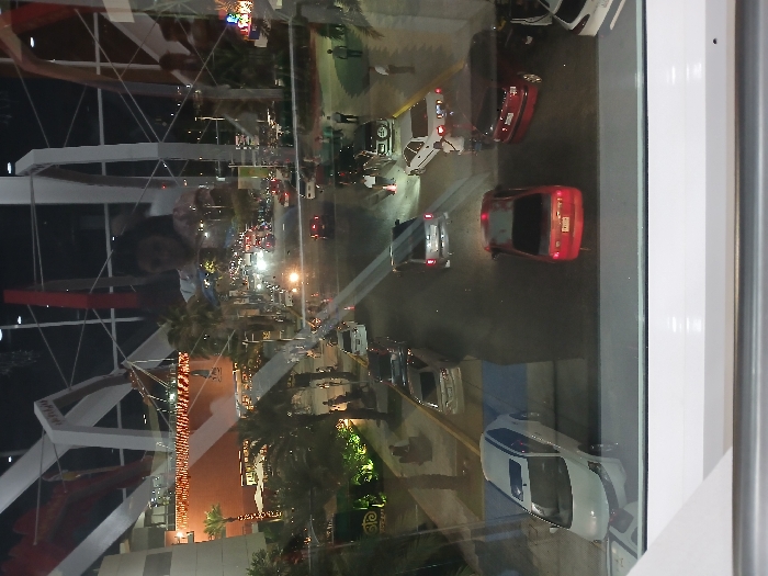 A nighttime view through a window captures a bustling street scene. Palm trees line the road, illuminated by streetlights and vehicle headlights. Cars of various colors, including red, white, and gray, traverse the road. Buildings and structures reflecting in the glass add depth and complexity to the image. A partial reflection of a face is visible within the window pane.