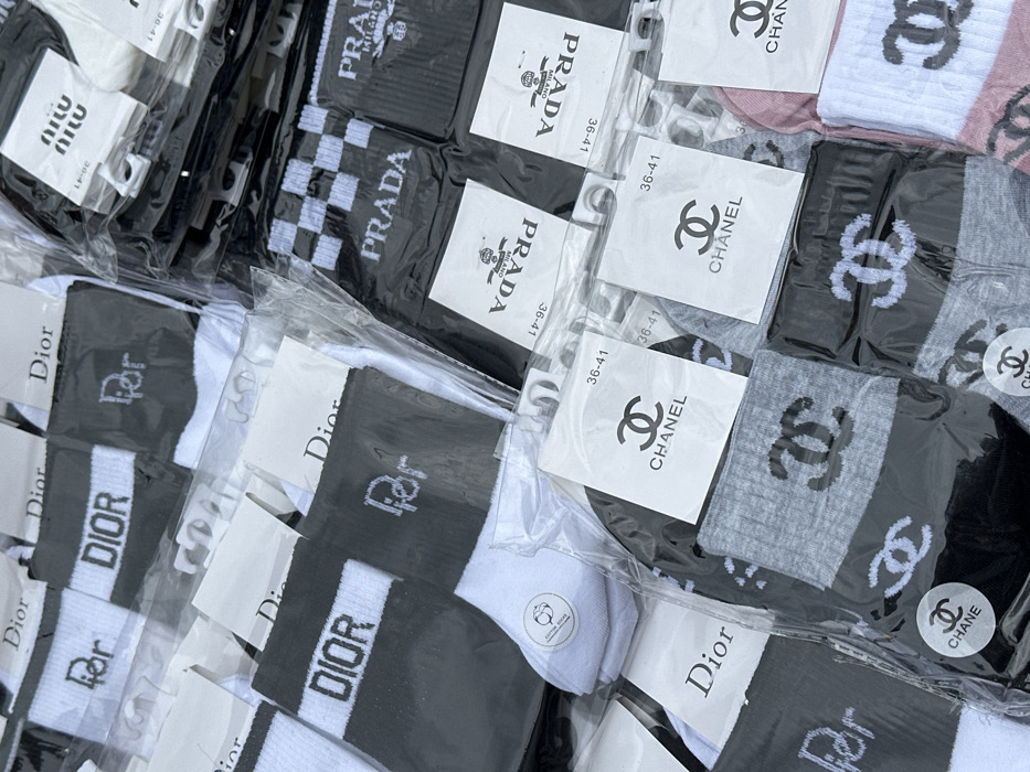 - "A high-angle, close-up photograph captures a dense display of numerous pairs of socks, individually packaged in clear plastic sleeves with accompanying paper hang tags" by FM-XMDnw2, licensed under CC BY 4.0