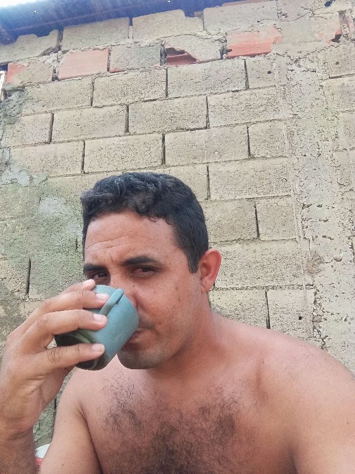 A shirtless man drinks from a pale blue mug. His dark, curly hair contrasts with the aging brick wall behind him. He has dark eyes and his gaze is directed slightly downward. Visible chest hair is noticeable. The brick wall shows signs of wear and tear, with variations in color and texture. A portion of a rooftop is visible in the upper left corner.