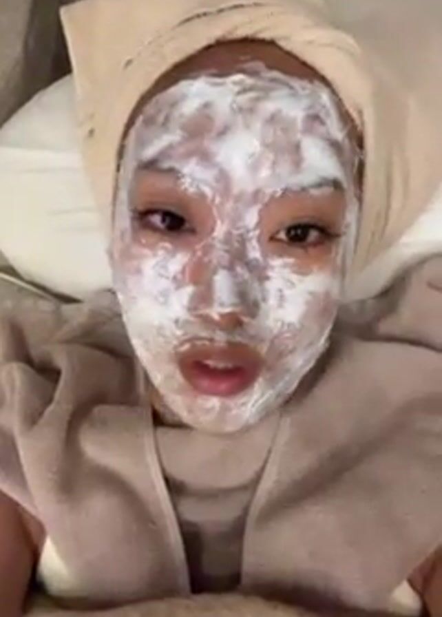 - "A woman with a white cream face mask and a towel wrapped around her head is lying down and speaking to the camera" by FM-4DZAk2, licensed under CC BY 4.0