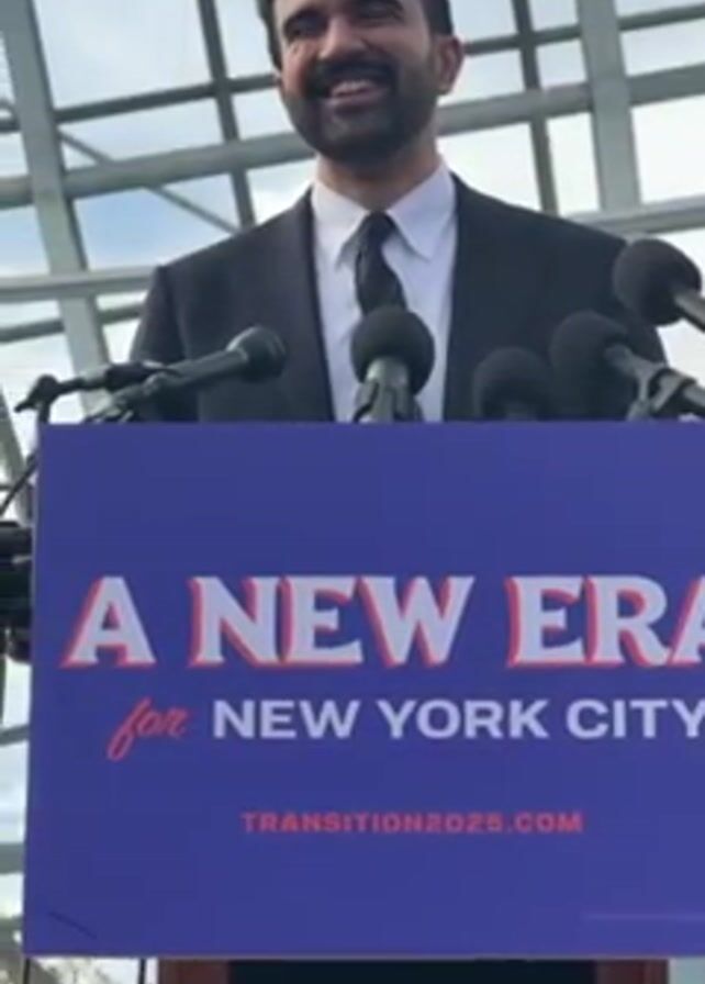 - "A man with dark hair and a beard, wearing a black suit, a white shirt, and a black tie, stands behind a podium labeled "A NEW ERA for NEW YORK CITY TRANSITION2025" by FM-ownra2, licensed under CC BY 4.0