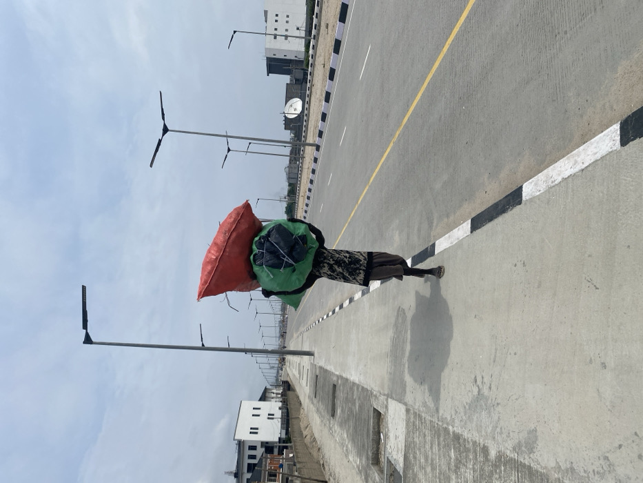 A solitary individual walks away from the viewer on a concrete sidewalk bordering a wide, paved asphalt road in Alaguntan, Nigeria. The person, an adult male, wears a patterned shirt and dark shorts, and is carrying two large, bulky sacks balanced on their head: a red sack stacked atop a green sack, the latter appearing secured with black ties. The concrete sidewalk features rectangular drainage openings. The asphalt road is marked with a continuous yellow center line and a black-and-white striped edge line. Numerous identical, modern streetlights with dark, flat heads line both sides of the road, extending into the distance under an overcast sky. Multi-story white buildings are visible in the background to the left, and a white building with a large satellite dish is present on the right. No other people or vehicles are visible.