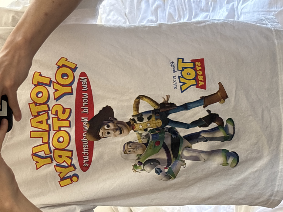 This image captures a white t-shirt held taut by a pair of light-skinned hands against a light-colored, rumpled fabric background, indicative of an indoor setting. A dark-colored smartphone or camera's reflection is visible between the hands at the top. The t-shirt displays a mirrored graphic design from Disney Pixar's "Toy Story." At the top, bold yellow-orange text with red outlines reads "YLATOT YROTS YOT" (TOTALLY TOY STORY reversed). Below this, a red oval banner contains white, mirrored text: "d lrow weN .erutnevda weN" (New World, New Adventure reversed). The central figures are detailed illustrations of Buzz Lightyear, in his white, green, and purple space suit, standing to the left, and Woody, in his cowboy hat, yellow plaid shirt, and denim, standing to the right. They are positioned side-by-side, appearing to interact. In the bottom right, a smaller mirrored logo reads "raxiP yenaiD YOT YROTS" (Disney Pixar TOY STORY reversed). This scene is located in the city of Kyoto, Japan.