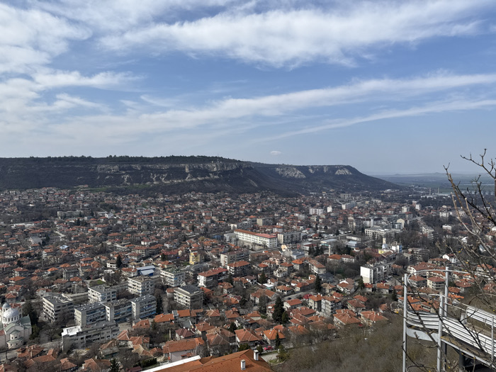This image captures a wide, elevated panoramic view of the city of Provadia, Bulgaria, situated within a valley