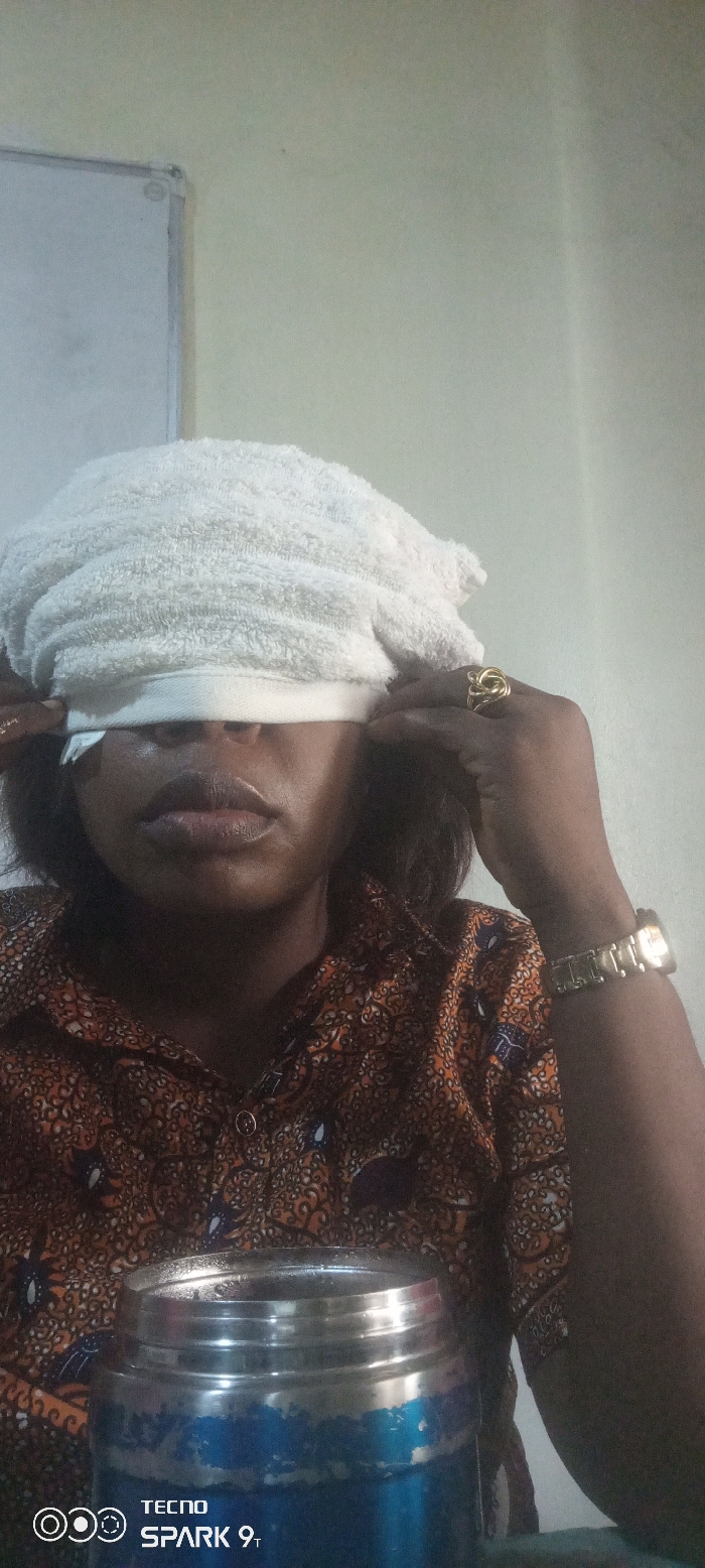 A female subject is seated indoors against a plain, light-colored wall. Her head is wrapped with a white terry cloth towel, which covers her eyes and forehead. A small white rectangular object is visible beneath the towel, positioned over the bridge of her nose. Her hands are raised, with fingers adjusting the towel and object over her eyes. She wears a long-sleeved shirt with an orange, brown, and blue patterned design. A gold-colored ring is present on her right ring finger, and a gold-colored wristwatch is on her left wrist. In the lower foreground, a blue thermal flask with a silver-colored rim is visible, showing signs of paint wear on its exterior. A portion of a white board with a silver frame is visible in the upper left background. The specific location within Agani, Nigeria, is not discernible from the image.
