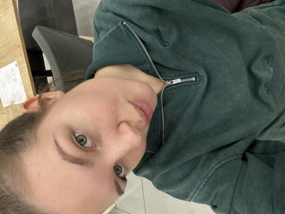 A young woman with light skin and green eyes poses at a tilted angle. She wears a dark green, zip-up sweatshirt with visible stitching. The zipper is silver. Part of a table and chair are visible in the background on the left. The overall lighting appears to be indoor and natural. The woman's expression is neutral.
