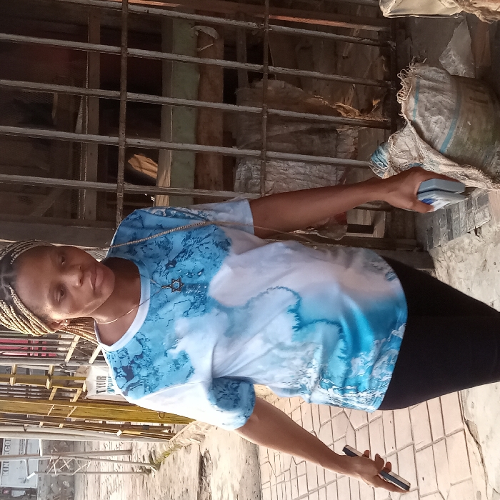 An adult female is depicted walking on a tiled sidewalk in Umuode, Nigeria. She has light-colored braided hair and wears a short-sleeved t-shirt with a blue and white abstract pattern, black leggings, and a necklace featuring a Star of David pendant. In her left hand, she holds a dark-colored smartphone. Her right hand holds a small, light-colored rectangular object, positioned above a partially filled, light-colored woven sack resting on the ground. To the subject's right, a multi-barred metal security gate or enclosure is visible, with various items wrapped in fabric or plastic sacks stored behind it. To her left, a metal gate structure and a building with obscured signage are present in the background. The scene is illuminated by natural daylight.