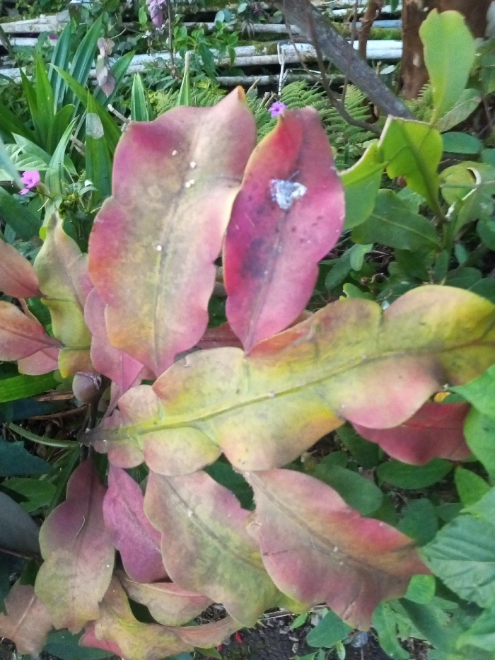 - "A close-up, eye-level outdoor photograph depicts a plant with numerous broad, undulate, leaf-like stems (phylloclades) displaying a color gradient from yellowish-green to prominent reddish-pink, particularly at the margins and tips" by FM-9wSr13, licensed under CC BY 4.0