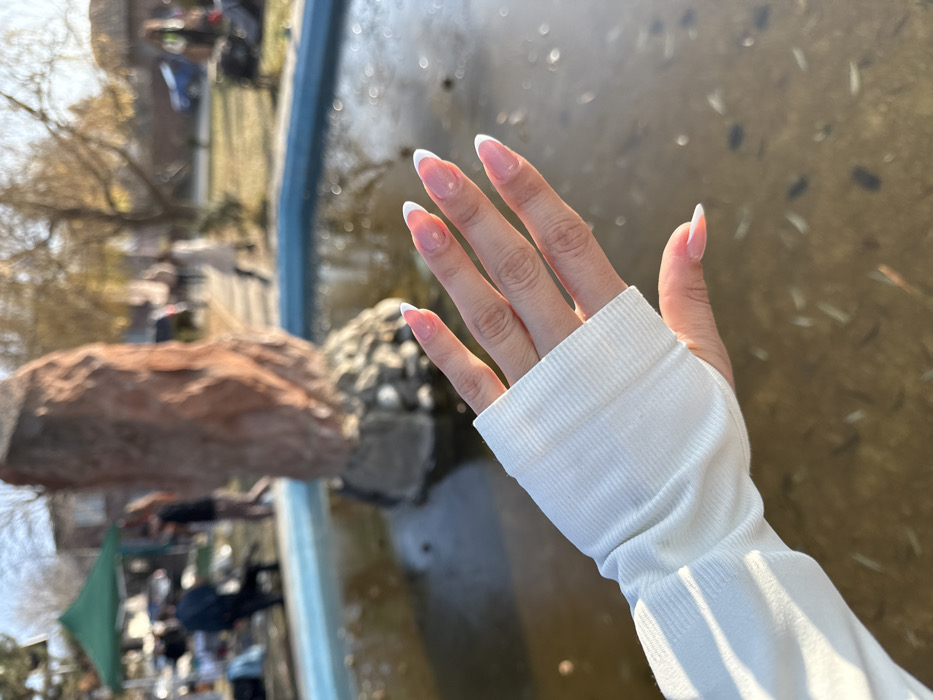 The image presents a close-up view of a human left hand in the foreground, set against an outdoor scene in Dsegh, Armenia. The hand, extended towards the viewer, exhibits a French manicure with clear pink base coats and distinct white tips on all visible fingernails. The wrist and lower forearm are encased in a white, ribbed, long-sleeved garment with a thumbhole cuff. Behind the hand, a circular fountain or pond with a light blue perimeter is visible. The water within the fountain is murky and brownish, reflecting ambient sunlight and containing scattered debris. A prominent, tall, irregularly shaped reddish-brown stone sculpture or formation, resting on a base of smaller rocks, stands in the center of the fountain. The background, heavily out of focus, reveals an outdoor public space, likely a park or town square. To the left, a green canopy tent shades an area populated by several indistinct human figures, one appearing seated, suggesting an outdoor gathering or market. To the right, additional blurred human figures are seen walking on a path. Sparse trees with bare branches and distant buildings are faintly visible under a bright, sunny sky.