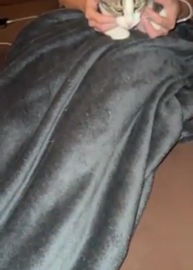 A woman is holding a tabby cat in her lap, on top of a gray blanket that covers her legs. She is wearing a blue tank top and a silver bracelet on her left wrist. Her hands are gently cupping the cat's face. The cat is mostly still, occasionally looking around with its green eyes. The blanket is draped over a brown couch. A white charging cable is visible on the couch beside the blanket.