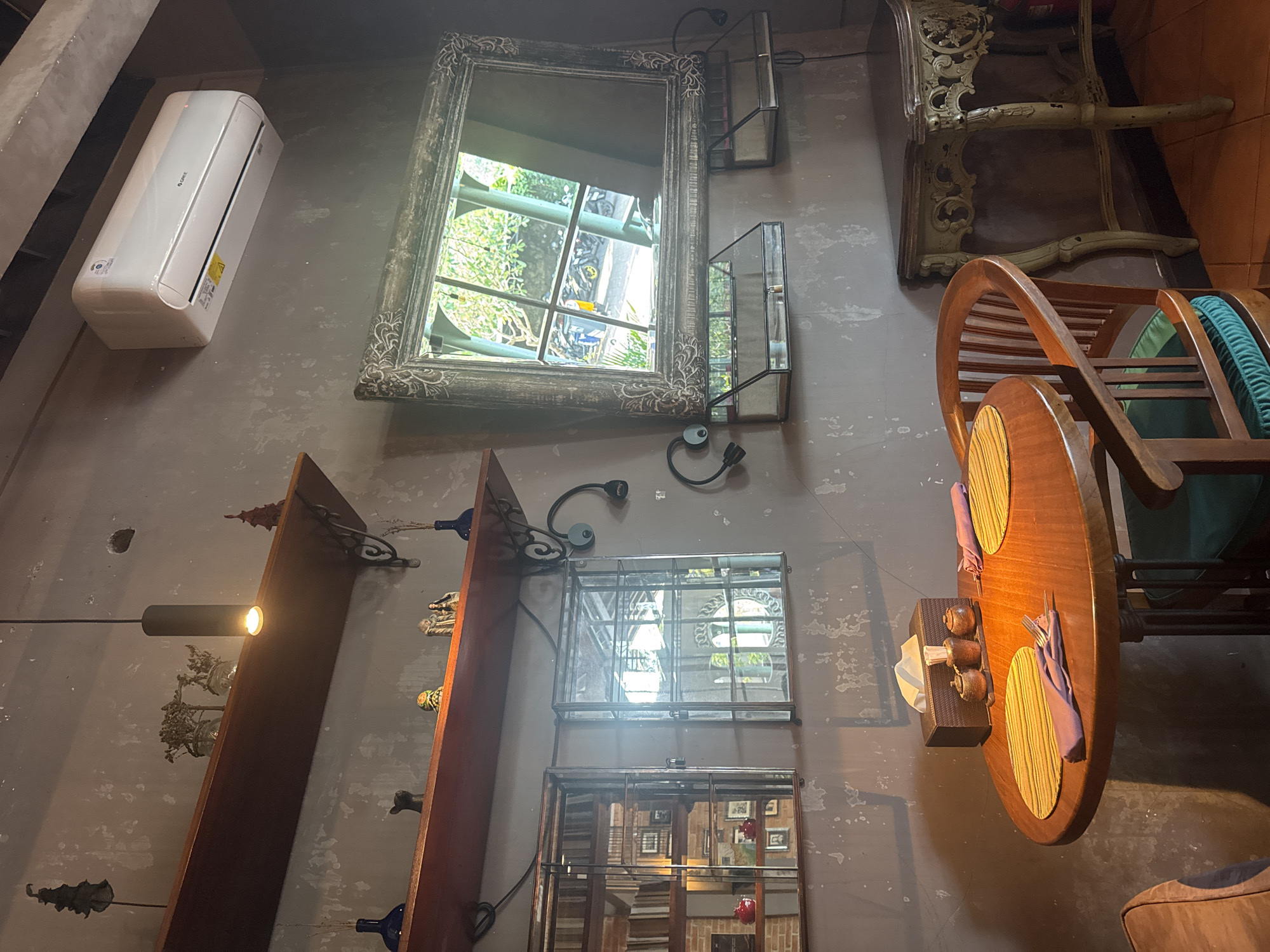 interior of a restaurant or cafe in North Kuta, Indonesia. The walls are grey and textured, adorned with various decorative elements, including a large ornate mirror reflecting an outdoor scene, several smaller mirrored shelves, and wooden shelves displaying various objects. An air conditioning unit is mounted high on the wall. A wooden table set for two with placemats and napkins stands near a wooden chair with a green cushion. A tissue box and small condiments are placed on the table. A pendant light hangs from the ceiling. There are no people visible in the scene.