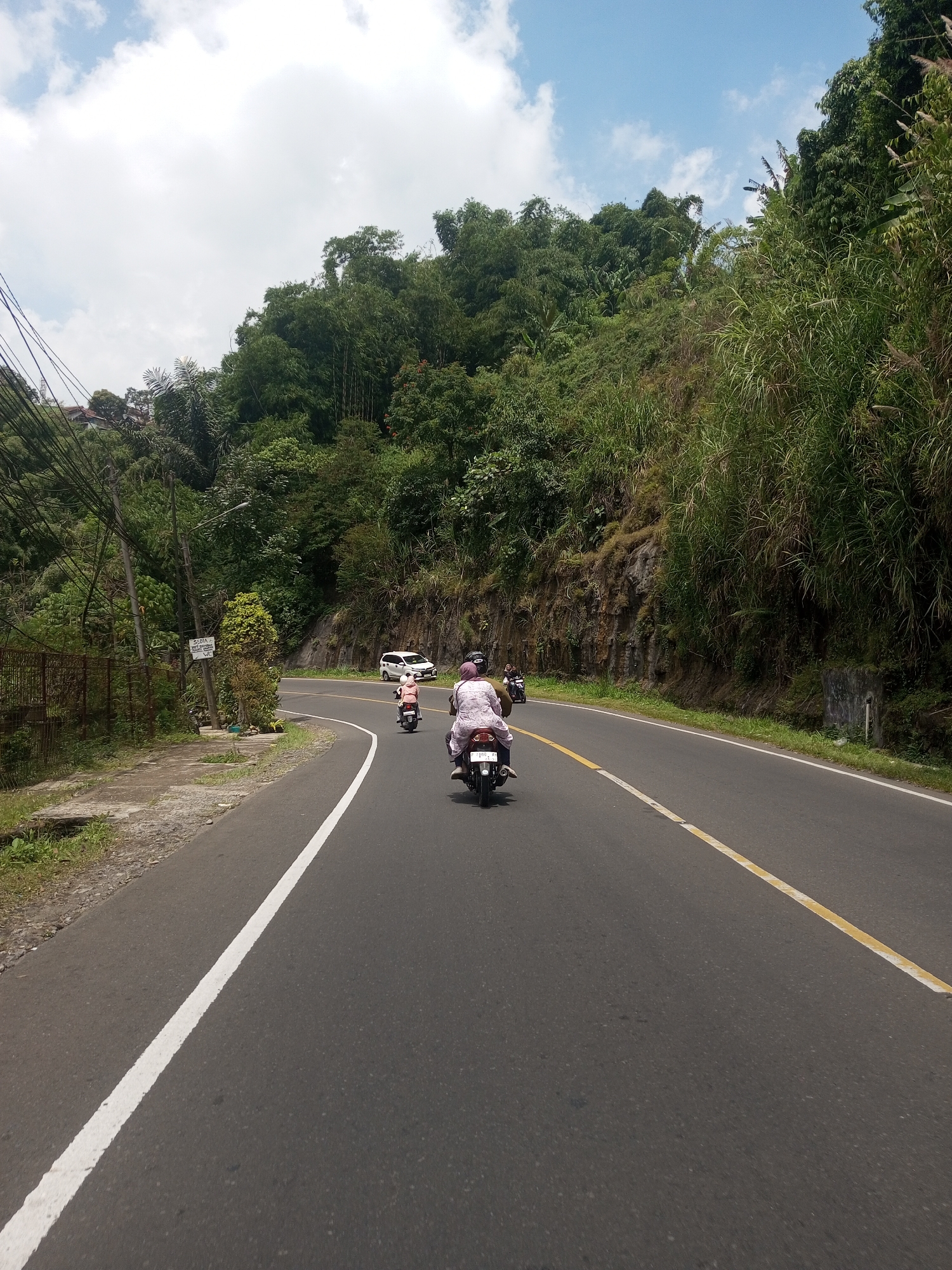 road winding through a hilly, forested area, likely a rural or semi-rural setting. There are multiple motorcycles traveling along the road. The road has lane markings, a white solid line on the left and a yellow solid line in the center. Dense vegetation covers the hillside to the right and left of the road. There's a white car parked on the side of the road, and the sky is partly cloudy. It is difficult to identify the specific location without additional information, and the claim about Nawng Hkar, Myanmar cannot be verified from the image alone.