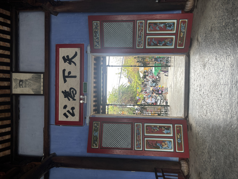 A vertical shot shows an open, decorated red door frame with a view to a bustling street scene. Inside, a blue wall is adorned with a framed portrait of a man and a long, vertical sign with black characters. The perspective emphasizes the contrast between the calm, historical interior and the vibrant, chaotic street outside, filled with parked scooters and people. The floor leading up to the doorway is made of light-colored stone.