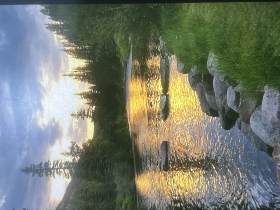 This image depicts a natural landscape in the city of Gura Top, Nigeria, at either sunrise or sunset. A river flows through the scene, its surface heavily reflecting bright, golden sunlight, creating prominent streaks of yellow and orange amidst the rippled blue-grey water. Several smooth, dark rocks are partially submerged within the river. The right bank of the river features a natural arrangement of grey and brown boulders, behind which vibrant green grass grows densely. The background is characterized by dense coniferous forests, with tall, slender trees silhouetted against the bright sky on the right, and a tree-covered slope visible on the left. The sky overhead is partly cloudy with patches of blue and grey, and a prominent bright light source, presumably the sun, is visible in the upper center of the frame. No individuals or specific man-made objects are visible within the frame.