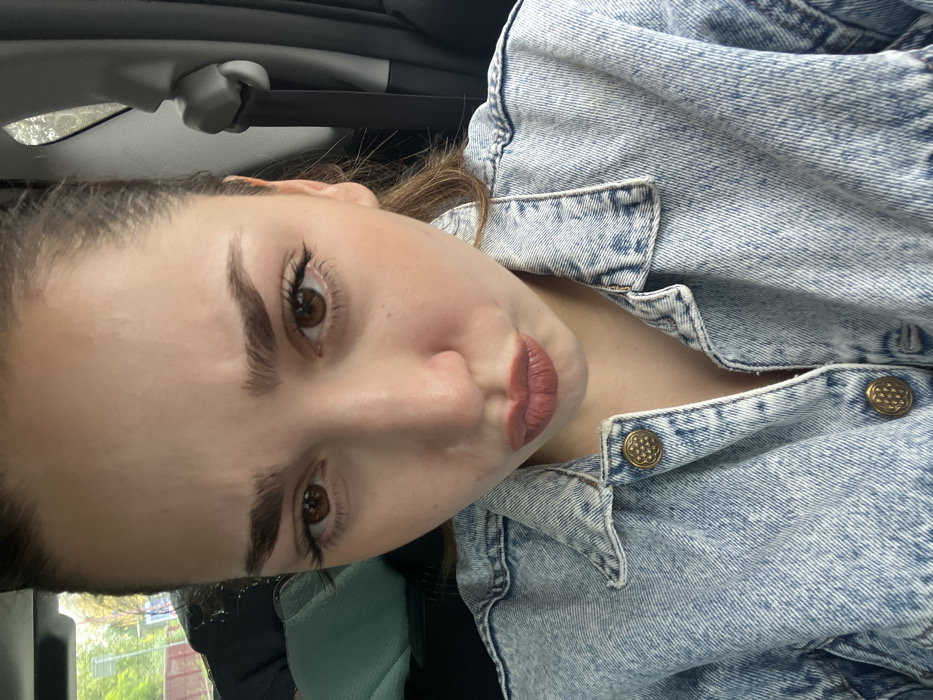 The image presents a young adult female, framed from the upper chest to the forehead, seated within a vehicle