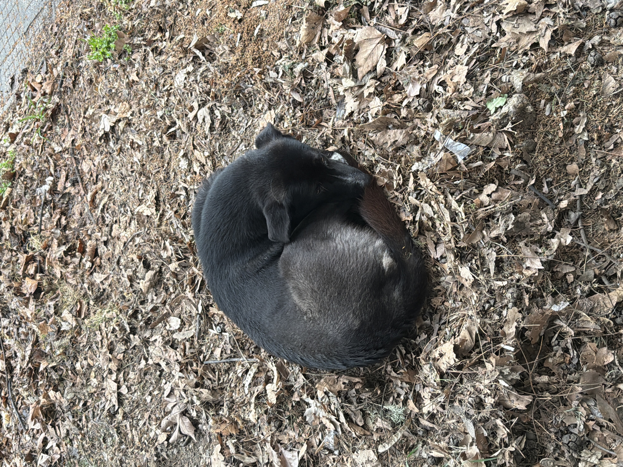 A black dog is curled up, resting on a bed of dry leaves and twigs. The background is composed of dead leaves, dirt, and sparse vegetation. A chain-link fence is visible in the upper left corner. The location is in an outdoor area with natural elements, potentially a park or garden within Pazardzhik, Bulgaria.
