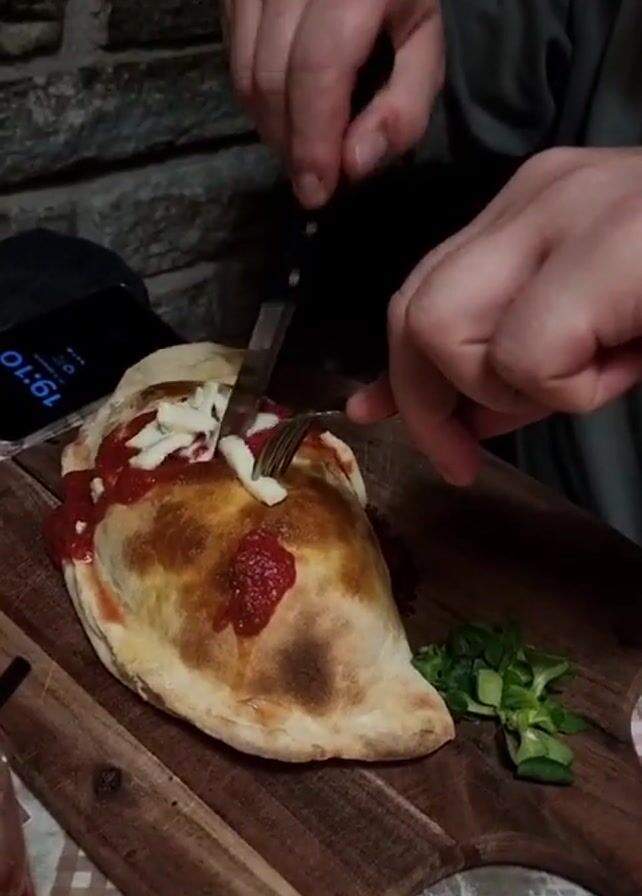- "A person wearing a gray shirt is cutting a calzone on a wooden cutting board with a knife and fork" by FM-Uq0Y63, licensed under CC BY 4.0