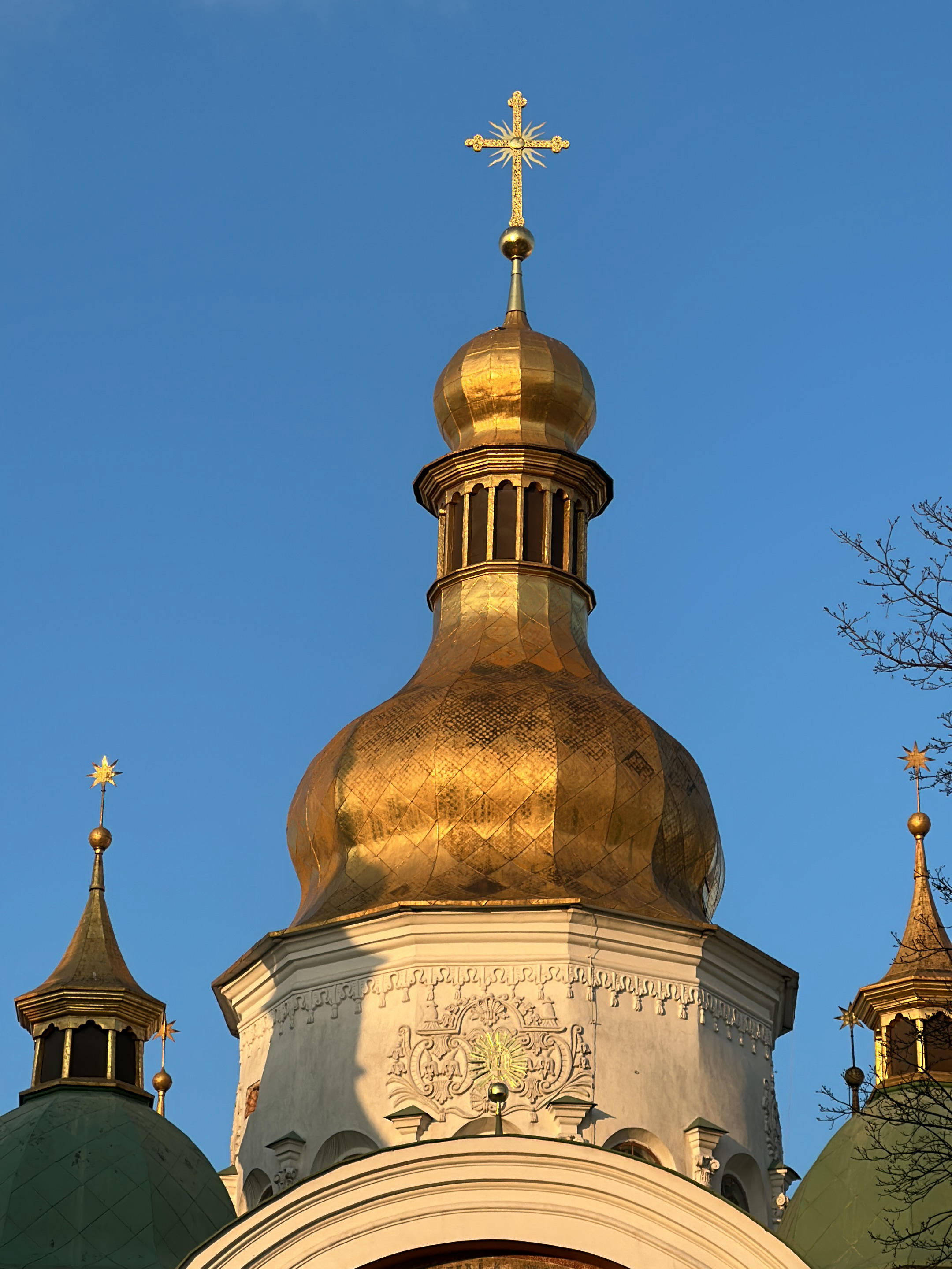 The image displays the upper sections of religious architecture, specifically the Dormition Cathedral (Uspensky Cathedral) within the Kyiv Pechersk Lavra monastic complex in Kyiv, Ukraine. A prominent, large golden onion-shaped dome occupies the central frame, featuring visible facets that reflect strong sunlight. This dome is crowned by a slender golden spire terminating in an ornate, radiant golden Orthodox cross. Below the main dome, a section of its supporting white drum is visible, adorned with intricate, light-colored bas-relief carvings or stucco work, illuminated on its left side and shadowed on its right. To the left of the central dome, a smaller cupola with a green roof and a golden spire topped with a golden star finial is partially visible. A similar golden spire and star finial appear on the far right. The structures are set against a clear, deep blue sky. Bare tree branches are discernible on the far right edge of the frame. No individuals, actions, or interactions are depicted in the scene.