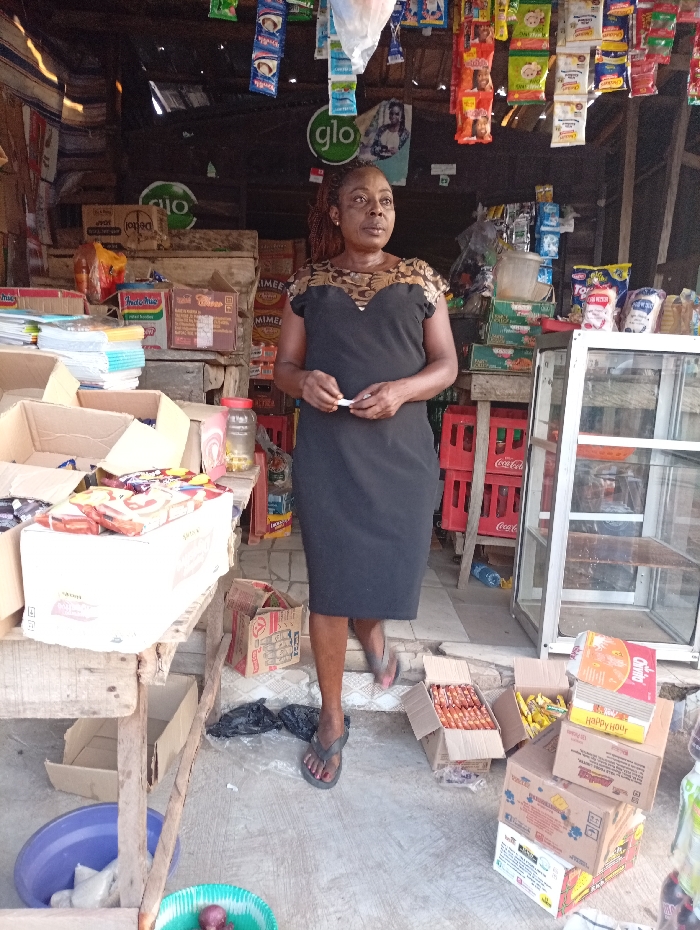 An adult female stands centrally within an open-front retail provision store located in the city of Unknown, Unknown. The subject, an individual of apparent African descent in her 40s or 50s, wears a knee-length black dress with a dark brown and gold patterned upper section and dark flip-flops. Her hair is styled in braids. She holds a small white object, possibly paper, in her clasped hands at waist level, and her gaze is directed slightly upwards and to the right of the frame. The store is densely packed with merchandise. Numerous sachets of snacks, sweets, and powdered drinks hang from the dark, low ceiling. To the left, a makeshift wooden table holds stacks of exercise books and packaged food items, including Indomie noodles. Beyond this, shelves and stacked crates contain various goods, with "Glo" telecommunications branding visible on several circular signs and a poster. To the right, a multi-tiered glass display cabinet stands empty, backed by red plastic Coca-Cola branded crates. The concrete floor around the woman is cluttered with open cardboard boxes containing packaged snacks and beverages, including "Chivita" and "Happy Hour" brands, along with several plastic bags and two plastic bowls containing red onions and other produce. The scene is illuminated by natural light entering the open storefront.