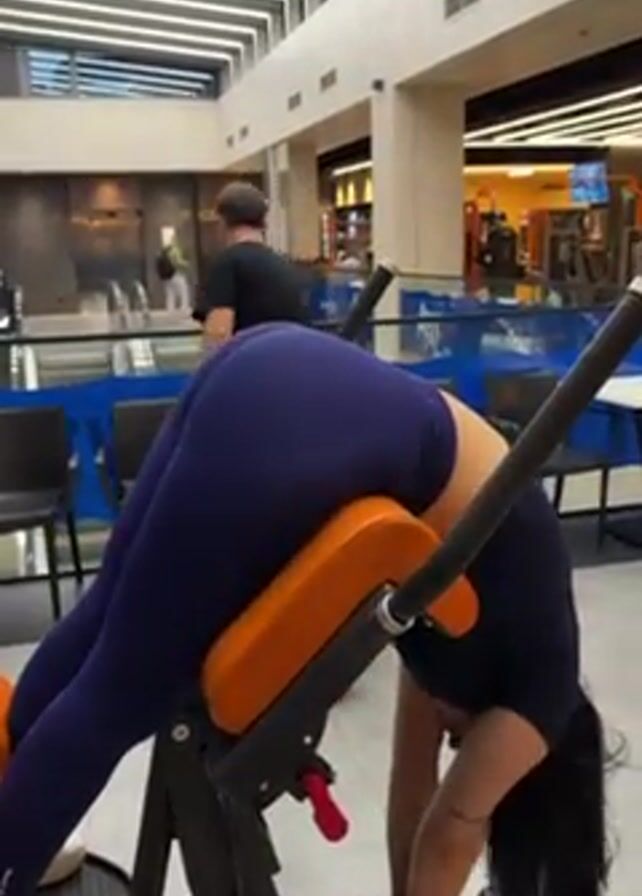 A woman wearing blue leggings and a black top is bent over a hyperextension exercise machine, with her torso positioned face down. She's holding dumbbells in her hands. The machine is a black and orange color. The scene appears to be inside of a shopping mall or open space with a gym or workout area visible in the background. Another person walks behind her near an escalator. The ceiling is decorated with a geometric pattern of lights. White tables and chairs can be seen behind her.