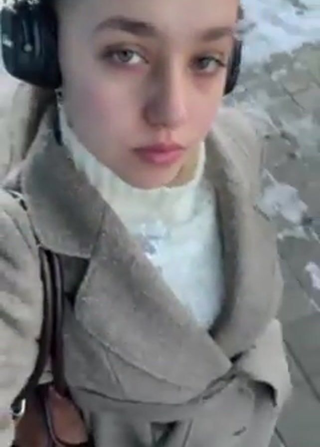A young woman walks outside on a winter day wearing a tan wool coat, white turtleneck sweater, and black headphones. She has her hair pulled back and wears a small ring on her left hand. She touches the skin on her cheek and beneath her eye. Cars and a snowy sidewalk are in the background.