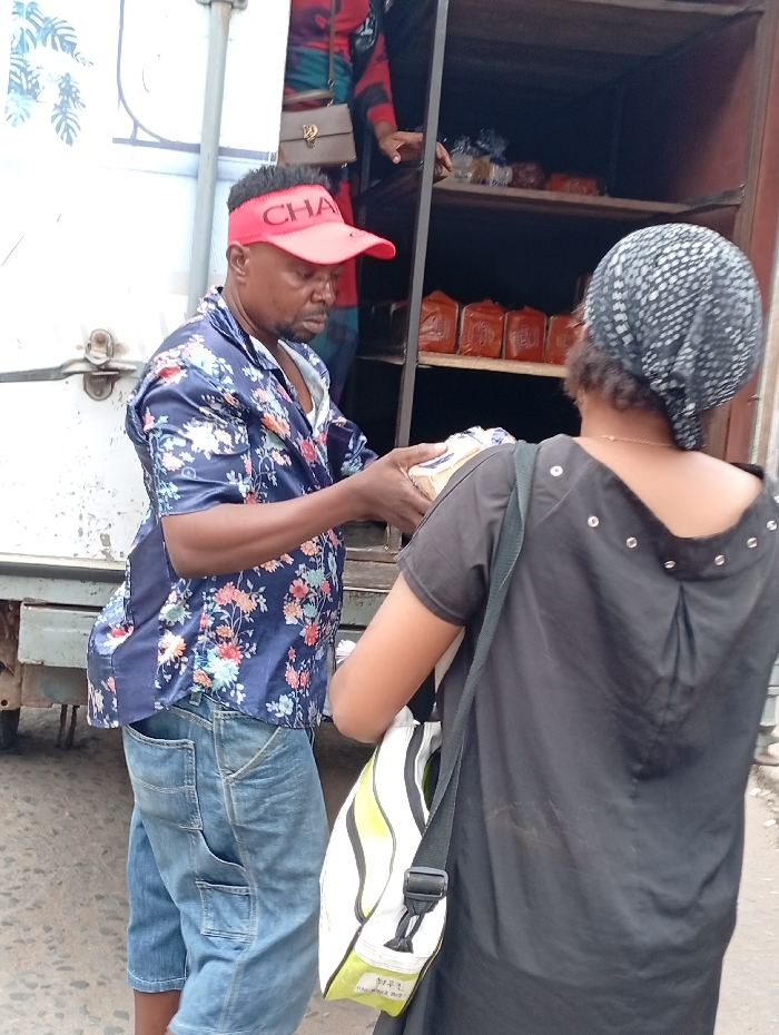 A vendor wearing a floral shirt, jean shorts, and a red visor hands wrapped bread to a customer in a black dress and patterned headscarf. The transaction occurs next to a truck. Behind the vendor, shelves within the truck display more bread loaves, some wrapped in plastic and others in red packaging. Another person with a purse is also in the background, seemingly looking at the bread.