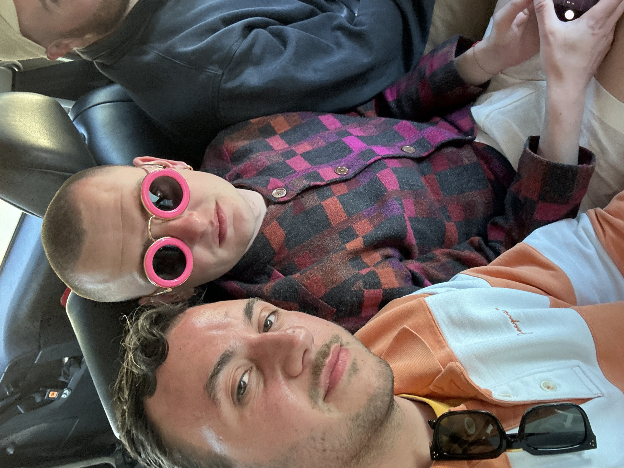Three individuals are positioned closely together in what appears to be a vehicle. The image is taken from an overhead perspective. A man with closely cropped hair and pink round sunglasses lies in the middle, wearing a multi-colored checkered shirt with buttons. Below him, another man looks directly at the camera; he has curly hair and a mustache, wearing a striped orange and white shirt with sunglasses resting on it. Above and to the side of the first man, a third person is partially visible wearing a dark-colored hoodie. One individual is holding a smartphone. Based on the available information, the location, Sant Antoni de Portmany, Spain, is not discernible from the provided image.