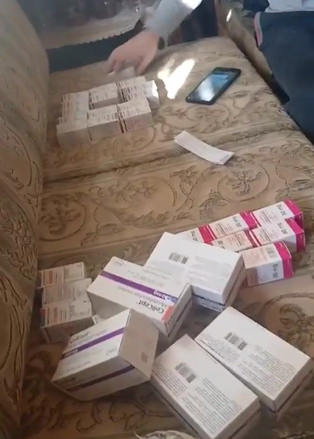 n indoor setting, specifically a couch covered in a patterned fabric. A person wearing a light gray long-sleeved shirt and dark pants is sitting on the couch. The couch is covered in numerous boxes of what appear to be medications, varying in size and color (mostly white and pink). A smartphone is visible on the couch as well. The person is arranging the boxes, moving them around on the couch. There's also a small yellow object (likely a toy) and some glass jars or containers on a shelf in the background. A piece of white paper is also on the couch.