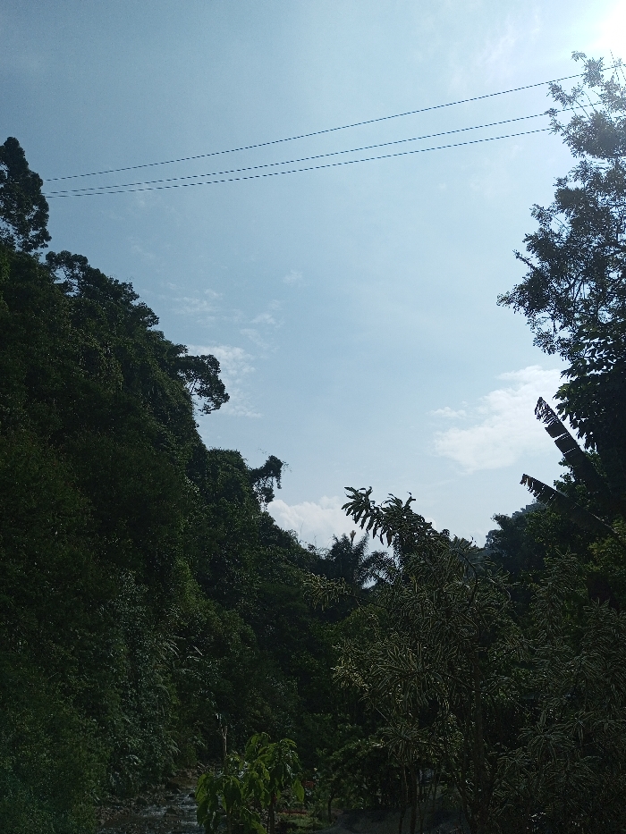 A verdant scene reveals a hillside blanketed in dense foliage, contrasting against a bright, partly cloudy sky. Power lines stretch horizontally across the upper frame. Trees frame the view, creating a natural border. The lower portion displays diverse plant life, some displaying lighter, variegated leaves. The overall impression is one of lush, tropical nature under a sunny sky.