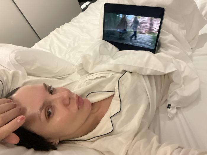 An individual is depicted lying on their back in a bed covered with white linens. The person, appearing to be female, has dark hair and is wearing white long-sleeved pajamas with dark piping. Her left hand is raised, resting near her forehead, revealing light pink nail polish on her fingertips. A small blemish or mark is visible on her forehead near her hairline. Her gaze is directed towards the camera. Propped on the white duvet in the upper center-right of the frame is a dark-colored digital tablet, displaying a video. The screen shows an outdoor scene with two figures, possibly female, against a background of foliage and light-colored rock formations. The figure on the right is in motion, walking. The background of the bedroom consists of a plain light-colored wall or headboard, with a darker vertical panel partially visible on the far left, suggesting a minimalist or modern interior, possibly a hotel room. No visual identifiers within the image directly indicate its location as Osaka, Japan.