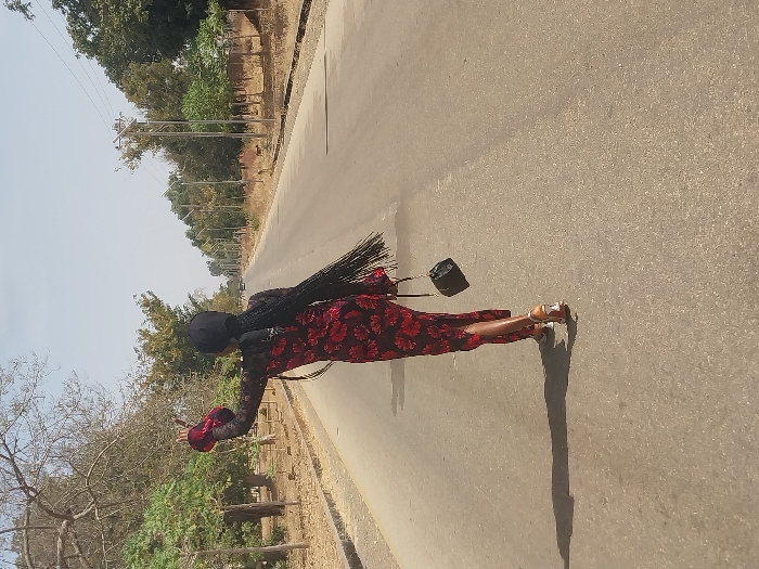 An individual is depicted walking away from the camera on a paved, two-lane road within the city of Bauchi, Nigeria, under a clear, bright sky. The subject, appearing to be a female, wears a long-sleeved dark dress with red floral patterns and flared cuffs, a black head covering, and long black braided hair. A small black handbag with a chain strap is held in the left hand, while the right arm is raised with the hand gesturing. The individual wears light-colored, open-toed high-heeled sandals. A prominent shadow extends to the subject's left on the light grey asphalt road. Both sides of the road feature dry, unpaved shoulders with sparse vegetation and trees, some with green foliage and others with bare branches. Utility poles with power lines are visible on the right side of the road, extending into the distance. A small animal, possibly a dog, is visible on the right shoulder further down the road. Faint outlines of vehicles are present in the distant background on the road.