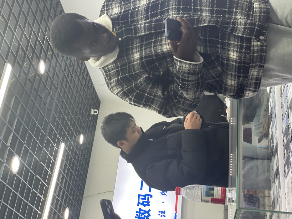 The scene depicts the interior of an electronics retail store, specifically a mobile phone outlet or repair shop, located in Shuangfu, China. The environment features white walls, a dark grey grid ceiling with integrated linear and circular LED lighting, and a white security camera mounted on the wall. A large white display screen in the background shows blue Chinese characters, including "数码二" (Digital Two). In the foreground, a glass display counter showcases numerous mobile phone accessories, such as cases and screen protectors. Two adult males are visible. On the right side of the frame, a dark-skinned male, wearing a black and white plaid jacket with a white fleece collar and light grey pants, is holding a dark blue smartphone in both hands and looking down at its screen. To his left, positioned behind the glass counter, an East Asian male wearing a black puffer jacket is also looking downwards, appearing to handle a small object or another device with his hands. A clear plastic water bottle with a red cap and a landscape-themed label rests on the glass counter near the second individual. Both subjects are independently focused on their devices or objects, with no direct interaction evident between them.