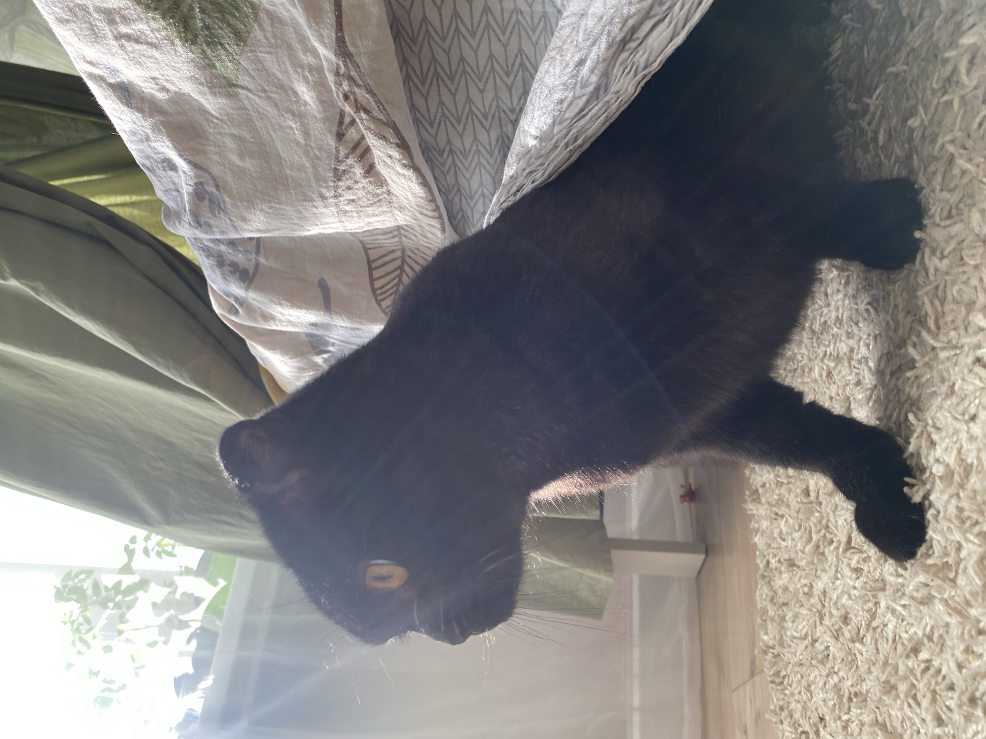 - "A black cat lies on a beige shag rug near a window in Chaikovsky, Russia" by FM-M4Ogq1, licensed under CC BY 4.0