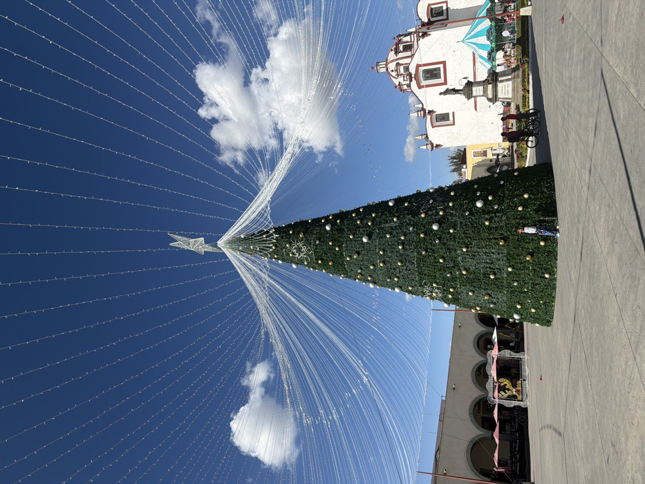 A large Christmas tree decorated with silver and gold ornaments dominates the scene under a bright blue sky with fluffy white clouds. Numerous strands of lights extend from the star at the tree's apex, radiating outwards. A white and red building with a dome sits to the upper right of the tree, while an arched structure appears at the bottom right. The ground is paved. The entire image is rotated counter-clockwise.