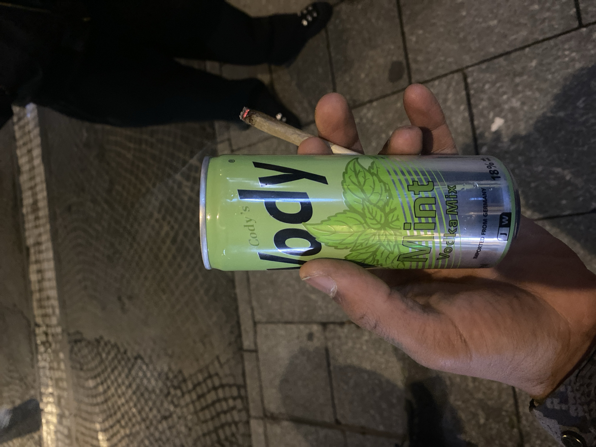 A close-up, low-light, outdoor scene depicts a person's hand holding a beverage can and a lit, hand-rolled item. The hand, with a dark to medium skin tone, is positioned centrally, exhibiting a patterned sleeve or bracelet on the left wrist. The beverage is an aluminum can, predominantly green and silver, labeled "Cody's Vody Vodka Mix Mint," specifying "IMPORTED FROM GERMANY" and "18%" alcohol by volume. To the right of the can, held between the person's fingers, is a lit, hand-rolled cigarette or joint, displaying a glowing ember. The background is dark and out of focus. The ground consists of patterned paving stones, characteristic of city sidewalks. Partially visible in the blurred background are the lower legs and feet of at least two other individuals. One person, to the right, wears dark trousers and dark shoes with light-colored decorative elements. Another person's dark shoe is faintly visible on the far left. The specific location within Paris, France, cannot be determined from the visual details provided in the image.