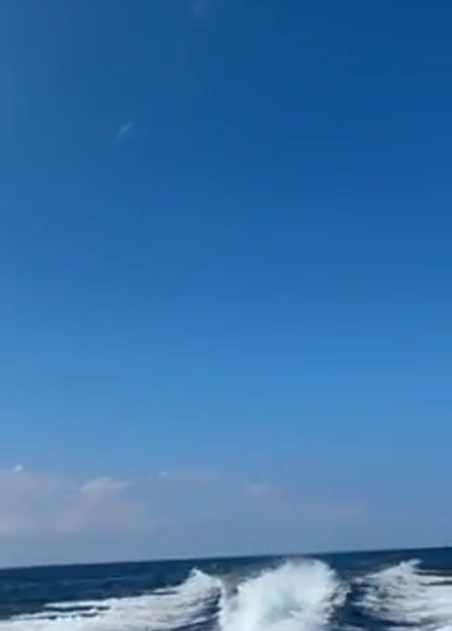 wake of a boat moving across the ocean on a bright, sunny day with a clear blue sky. The water is dark blue and churned up behind the boat. In the distance, there is land with trees.