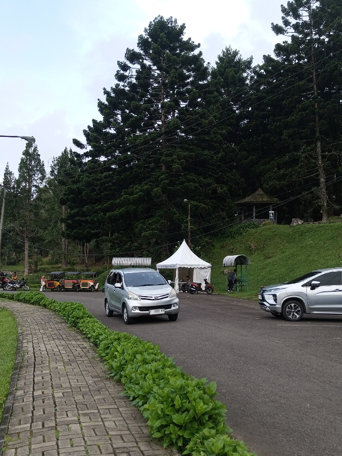 The scene depicts an outdoor environment in Ambositra, Madagascar, under an overcast sky. A paved asphalt road curves through the center-right of the frame, bordered on the left by a concrete block pedestrian path and a strip of low, vibrant green foliage. Manicured grass lies to the left of the path. In the mid-ground, a silver Toyota Avanza (license plate F 3332 KY) is driving towards the viewer on the paved road. To its left, several motorbikes and a line of five colorful, vintage-style open-top vehicles (red, yellow, orange) are parked on a dirt area. A few indistinct individuals are near these parked vehicles. A tall street lamp is visible on the far left. On the right side of the road, a silver Mitsubishi Xpander is partially visible, facing away from the viewer. Behind it, a white pop-up tent labeled "STADION" is set up, with a red scooter and two individuals present near it. Further right and elevated on a grassy slope, a small, open-sided shelter with a striped roof contains one seated individual. Above this, a small, dark-roofed gazebo or pavilion is situated on the green terrain. The background is dominated by a dense forest of tall, dark green coniferous trees covering a rising hill or mountain. Utility poles and overhead wires traverse the scene at mid-height. The sky is uniformly light grey.