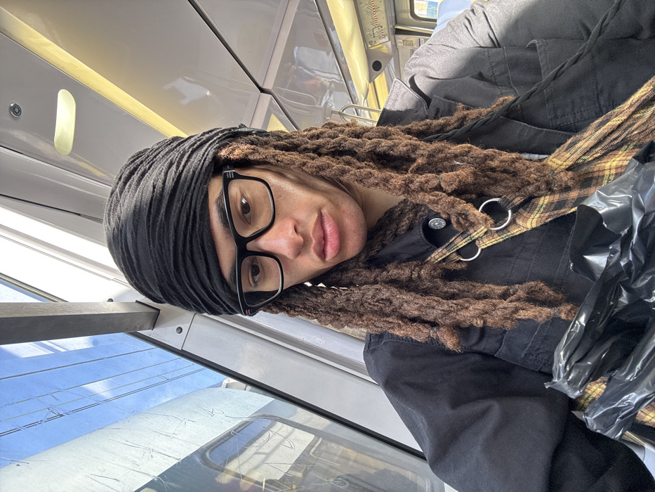 An individual with medium-dark skin tone is depicted from the chest up, seated inside a modern public transport train carriage in Palaiseau, France. The person wears a black headwrap and black-framed eyeglasses. Numerous brown dreadlocks are visible, framing the face and resting on the shoulders and chest. A dark, possibly black, button-down jacket or shirt is worn. A plaid strap, featuring yellow, brown, and black colors with two silver rings, crosses the upper torso. Below this strap, a crumpled black plastic bag is partially visible. The individual has a neutral facial expression and appears to be looking slightly downwards and to their left. The train interior features light-colored, curved ceiling panels with integrated linear lighting. A window on the left reflects a clear blue sky and an exterior structure, possibly another train carriage. Distant light-colored seats are faintly visible in the background on the right.