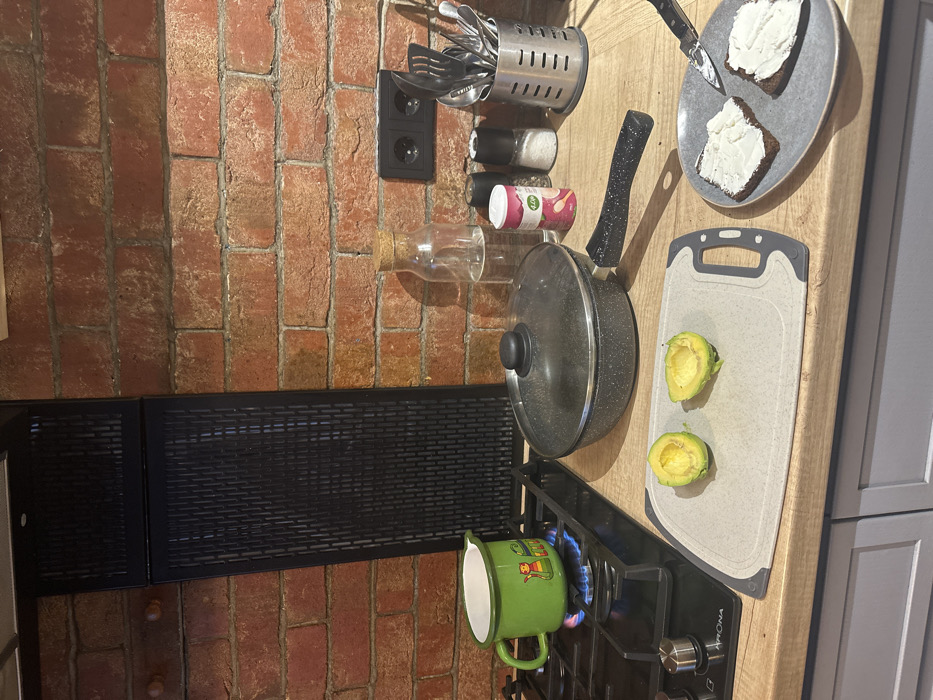 A kitchen scene shows a red brick wall with kitchen utensils, spices, and a glass bottle attached. A black vent is near the wall. On the counter, a frying pan sits beside a cutting board with avocado halves. A plate holds bread with cream cheese. A green mug heats on a lit gas stovetop. The counter blends into light grey cabinets on the right.