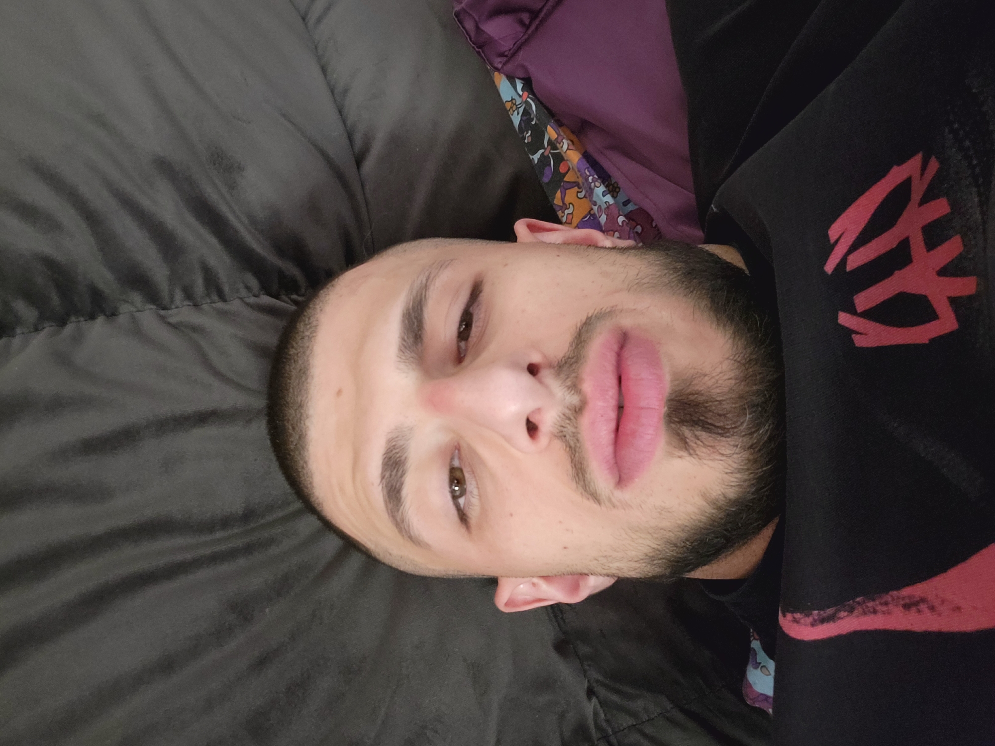 A man with a shaved head, light skin, dark eyebrows, and a beard lies on a dark grey bed sheet with a black sweatshirt. He has brown eyes and plump lips. A purple and patterned pillow is partially visible behind him. The sweatshirt has a red abstract design on the sleeve. The location, Bankya, Bulgaria, is not discernible from the visual data provided.