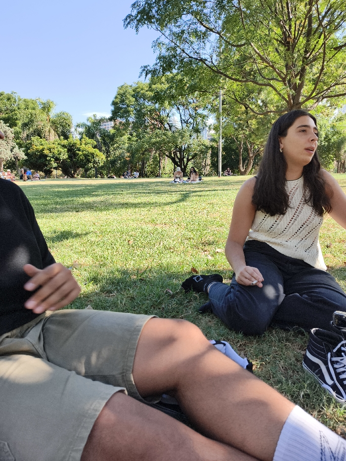 A woman sits on green grass in a park, wearing a white top and dark pants. She holds a cigarette in her hand. Beside her, a person wears a black shirt, tan shorts, and white socks. In the background, other people relax on the grass under trees and a clear blue sky. Black and white Vans sneakers sit beside the woman.
