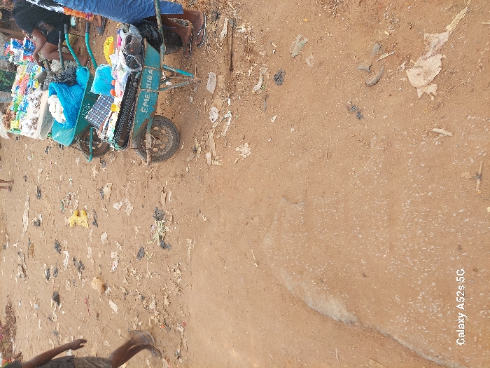 The image depicts an outdoor market scene in Awkuzu, Nigeria. The ground consists of unpaved, reddish-brown dirt, extensively scattered with various debris, including black, yellow, and white plastic bags, as well as miscellaneous paper and refuse. On the left side of the frame, a person is partially visible from the lower thighs down, wearing dark shorts and flip-flops, in the act of walking from left to right across the dirt ground. On the right side, two teal-colored wheelbarrows are positioned, functioning as vendor stalls. The front wheelbarrow bears the inscription "EMENUGA" in white lettering on its side and is laden with various merchandise, including patterned textiles, light blue fabric, and spherical reddish produce. The second wheelbarrow, situated behind the first, contains a blue plastic bag filled with white items and other packaged goods. Behind these wheelbarrows, two individuals are partially visible, seated. One individual, wearing dark clothing and flip-flops, is positioned near the front wheelbarrow. A second individual, also in dark clothing, is seated further back amidst a larger display of packaged commodities and produce arranged on a raised surface or table. The overall scene is illuminated by natural daylight. The watermark "Galaxy A52s 5G" is visible in the lower-left corner of the image.