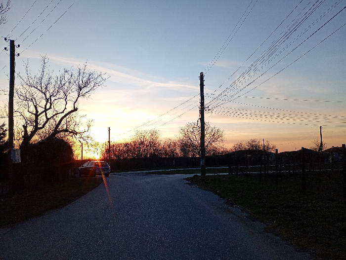 The image depicts an exterior scene in Alfatar, Bulgaria, at either sunrise or sunset, with the sun positioned low on the horizon, emitting an orange and yellow glow across the sky. A dark asphalt or gravel road curves from the lower center of the frame, extending into the mid-ground. A distinct lens flare is visible on the road surface towards the center. On the left, a large, bare deciduous tree is silhouetted against the bright sky, partially obscuring a dark-colored sedan parked on a grassy shoulder. A wooden utility pole, equipped with multiple overhead wires, stands prominently on the left. A secondary wooden utility pole, also supporting multiple wires, is positioned on the right side of the road. The background consists of a dense line of leafless trees, beyond which the faint outlines of several residential structures are visible against the illuminated sky. The upper sky is clear blue, gradually transitioning to vibrant orange and yellow near the horizon. No individuals, actions, or interactions are depicted in the scene.