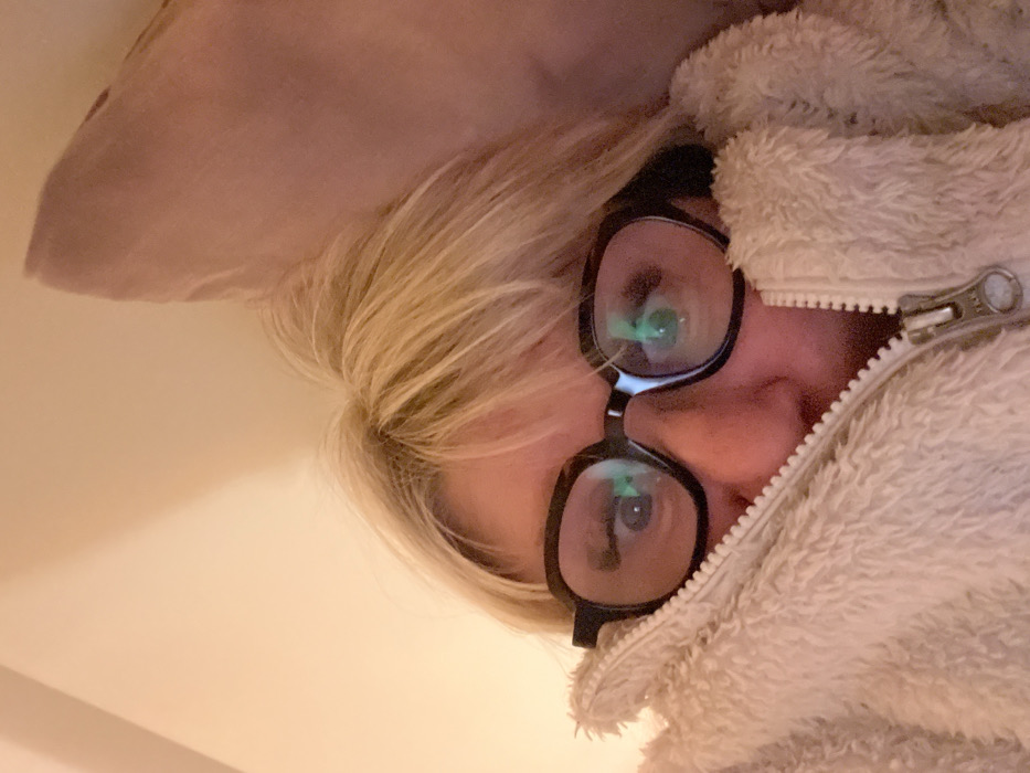 A person with blonde hair and black-framed glasses is partially obscured by a fuzzy, cream-colored jacket zipped up near their face. A tan pillow is positioned above their head. The angle of the shot is low, looking up towards the person. Light reflects in the lenses of the glasses. The overall color palette is neutral and warm.