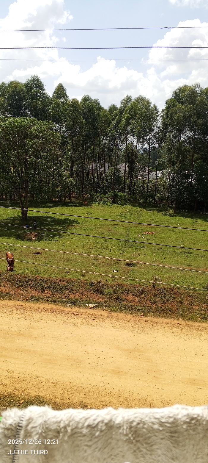 The image depicts a landscape in the city of Bogusero ward, Kenya, viewed from an elevated position. The foreground is occupied by a wide, unpaved dirt road of light brown color. Immediately beyond the road, a grassy field slopes upward. On the left side of this field, a brown and white cow with a rope around its neck is grazing. Further into the field, beneath the shade of a large, leafy tree, two individuals are present: one is seated or crouched on the ground, and the other stands nearby. Multiple thin, dark horizontal lines, consistent with wires or fencing, traverse the grassy field. Scattered small pieces of refuse are visible on the grass. The background is dominated by a dense stand of tall, slender trees, predominantly green, which obscures most distant views. Partially visible through the trees in the center-right are the reddish-brown tiled roofs of several buildings. The sky above is clear blue with scattered white cumulus clouds. A blurry, textured object, likely part of the immediate foreground, covers the bottom portion of the image, with a digital overlay showing "2025/12/26 12:21 JJ THE THIRD".